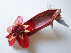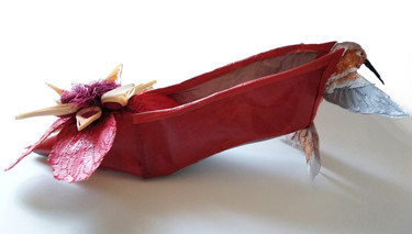 So I began again, with both the shoe and the hummingbird, for he also needed to be completely rethought. Rather than heavy and chubby he needed to become light and airy. I turned back to quilling. I quilled his body, added tissue paper to his wings and started cutting away some of the back layer of a large red flower I'd sewn from gold card, covered with orange and then red tissue paper