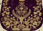 "This is one of five important robes worn by a monarch during the service, but unlike the robe of state it is purple, referencing Roman emperors. The imperial mantle, which had been perfectly preserved and kept in private hands since 1821, is a beautiful example of Spitalfields handloom work, which had been of Huguenot origin. The emblems of the three Kingdoms of England, Scotland and Ireland are skilfully woven into the fabric."